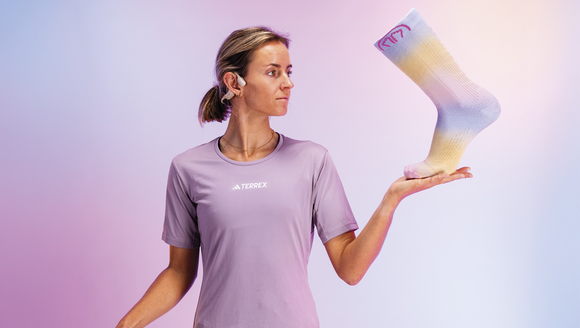 Caitlin Fielder, Siegerin beim Grand Trail des Templiers 2024, hat diese Socke farblich gestaltet: Sie ist anatomisch, dünn und atmungsaktiv. Ein Gripband sorgt für Haftung auf der Sohle, Stabilität und Komfort. Caitlin: „Bei dieser Socke geht es nicht nur um kräftige Farben, sondern auch um Selbstentfaltung, Energie und Bewegung – alles Elemente des Trailrunnings“.